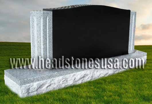 This striking high quality solid granite memorial features a top of jet black granite enhanced on each side by a carved column shaped kicker in gray granite. The top features a polished front, back and top that measures 36 inches left to right, 20 inches top to bottom, and is 6 inches thick. The base features a polished top and margin followed by a front, back, and sides that are rough cut. The base measures 60 inches left to right, 12 inches wide, and 6 inches high.