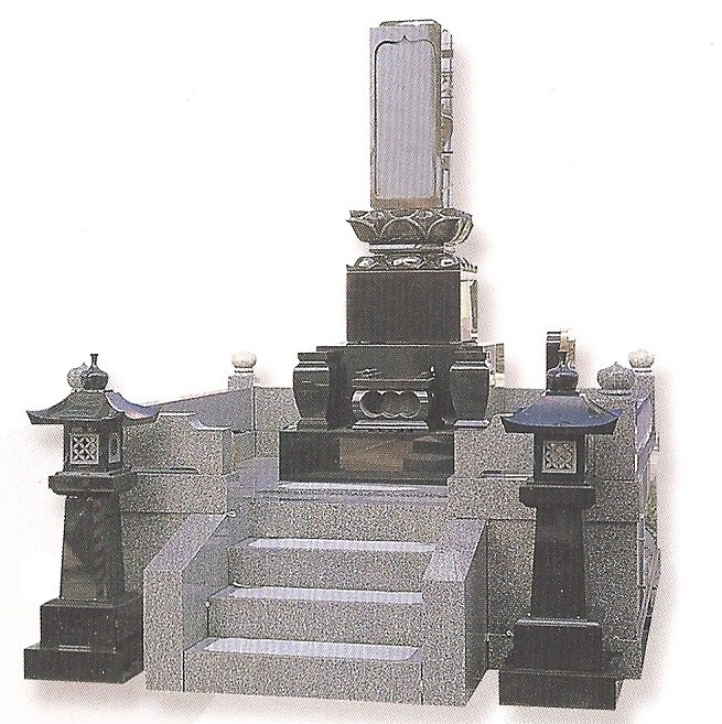 This Japanese style monument is shown in G614 grey granite and jet black granite. Steps leading to kneeling alter with two lantern vases on the outside.