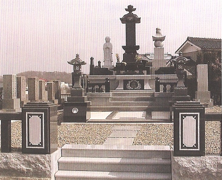 This Japanese style memorial gravestone has detailed carvings and a traditional memorial setting.