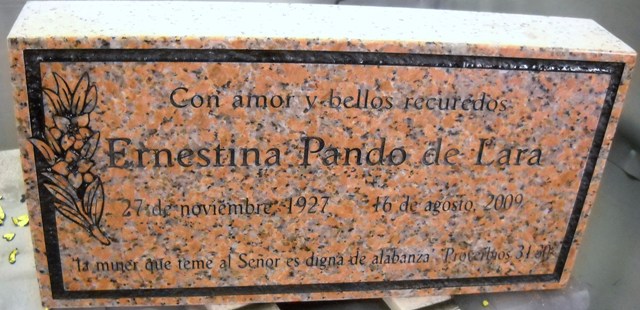 This lovely gravestone with saw cut sides and polished top is shown with the optional sandblasted outline and a floral design which are both available for an additional charge. The bold lettering is done in Spanish and highlighted by a black litho paint. Engraving is available in multiple languages so contact us with your specific needs and we will be happy to assist you.
