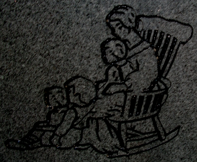 This loving and maternal cemetery headstone design features a woman in a rocking chair surrounded by adorning children the perfect tribute to a beloved mother or grandmother. Shown here engraved into our high quality solid G654 Gray Granite and then enhanced by the addition of a black lithihchrome stone paint.