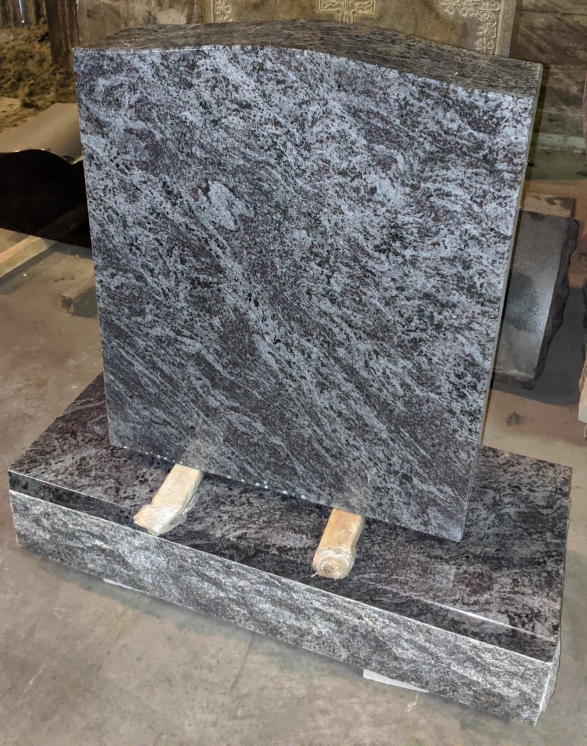 This cemetery gravestone is pictured in Bahama Blue granite color.