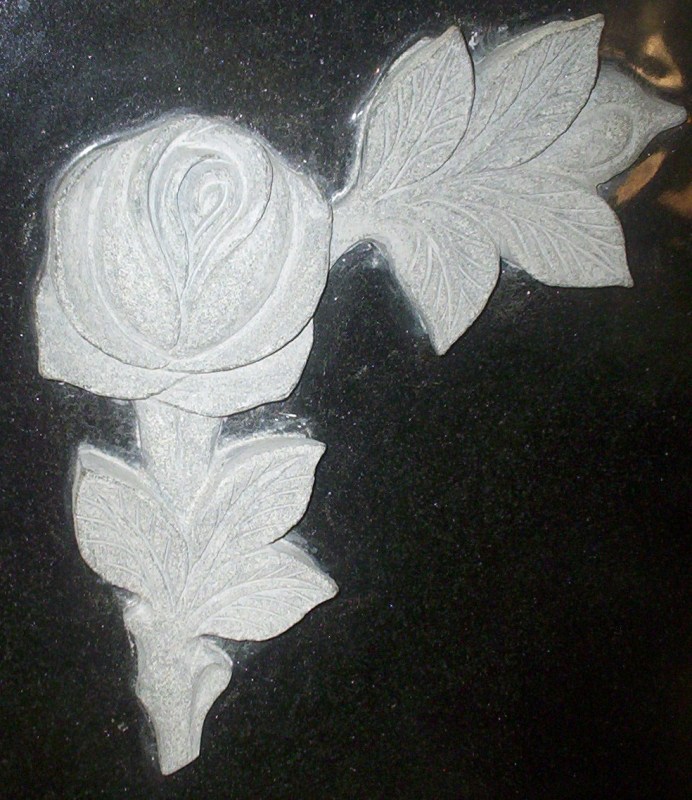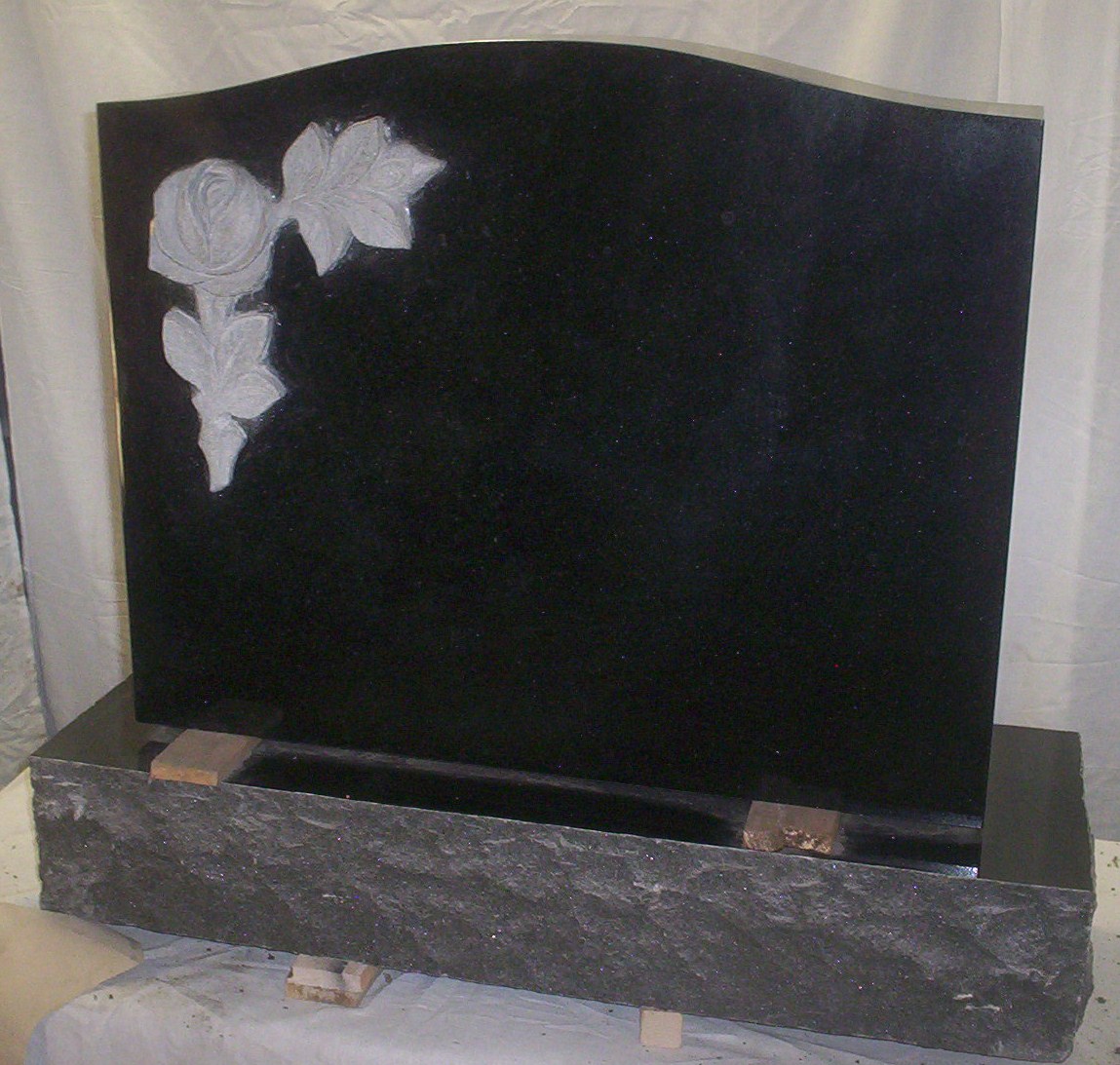 Carved Flower Monument This elegant memorial is featured in jet black and contains carved gray flowers on the upper left side. This monument is spacious and provides ample room for customization. Here, the headstone features a single epitaph. |  Engraved Upright Headstone with Carved Flowers This is one of our completed carved flowers memorial in solid black granite. This upright headstone has custom laser etched engravings including a picture of the deceased. Email chris@headstonesusa.com to personalize your memorial. |