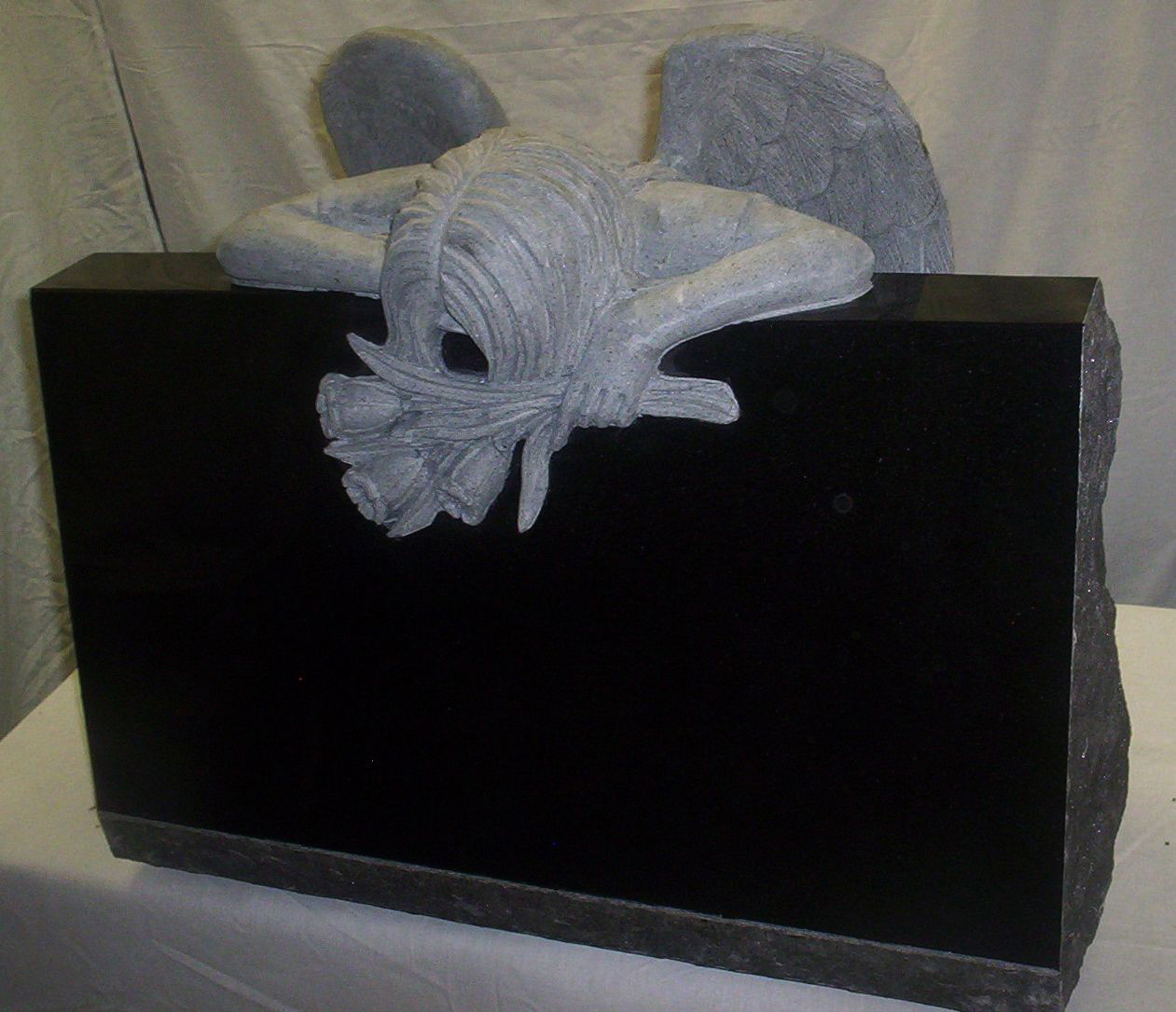 Striking Weeping Angel Cemetery Memorial This unique cemetery slant features a carved weeping angel. The engraving was sandblasted and highlighted with white litho paint. Call for details at 314-807-6910 |