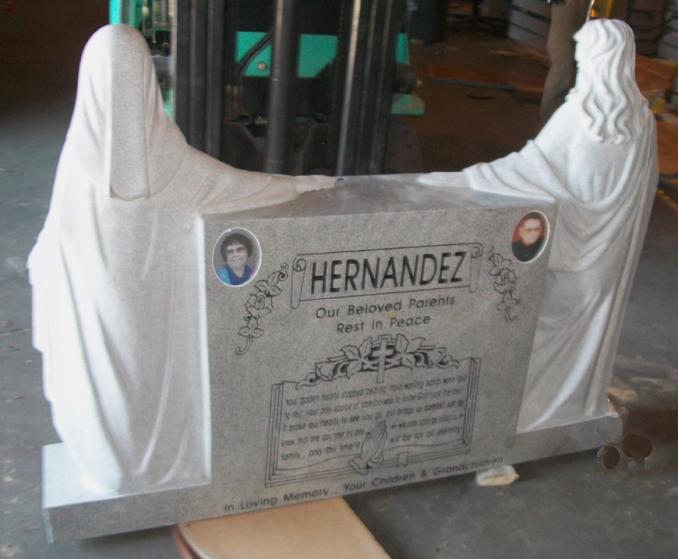 This beautiful and intricately detailed memorial features a pair of statues. Jesus on one side and his mother Mary on the other with an upright monument between them and their outstretched arms. As shown here, the front and back of the statues are carved and both the front and back of the upright are polished to provide lots of room for personalization such as designs, custom epitaphs, and ceramic photos.