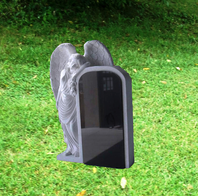 This high quality solid jet black granite carved angel upright memorial is priced to include a base (which is not pictured) and features a highly detailed carved angel on the left side leaning on an upright polished face with plenty of room for personalization. This monument is available in a variety of colors and sizes. For more information and a custom quote specific to your needs please call or email us with your design requirements.